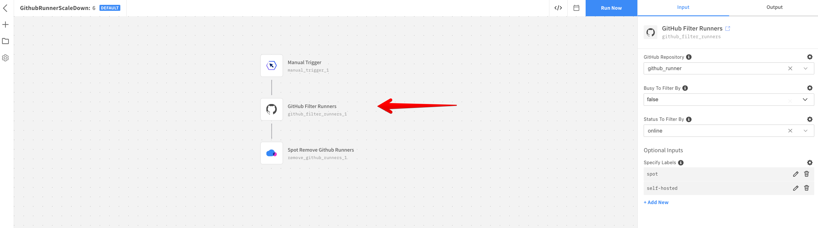 - Click the GitHub Filter Runners action node.